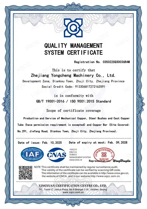 Fabricamos nuestros cojinetes deslizantes de bronce con metales de alta pureza (99.99 %) y adaptamos cada aleación a los requisitos del cliente y a los estándares de rendimiento. Utilizamos nuestra fundición centrífuga patentada para un procesamiento preciso y cada lote se prueba y registra, garantizando trazabilidad y consistencia. Además, conservamos las muestras hasta cinco años o más si se requiere para asegurar la durabilidad y confiabilidad de nuestros productos.